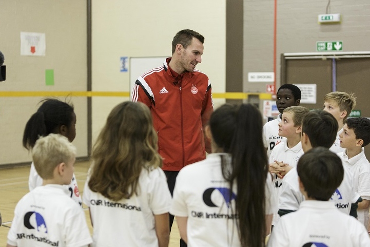 The visit took place as a reward to Cults Primary School for their previous participation in our fundraising through football scheme, Dons Day Out, sponsored by CNR International (UK) Ltd. Scott fielded questions from around 20 kids before holding a penalty shootout in the school gym hall!