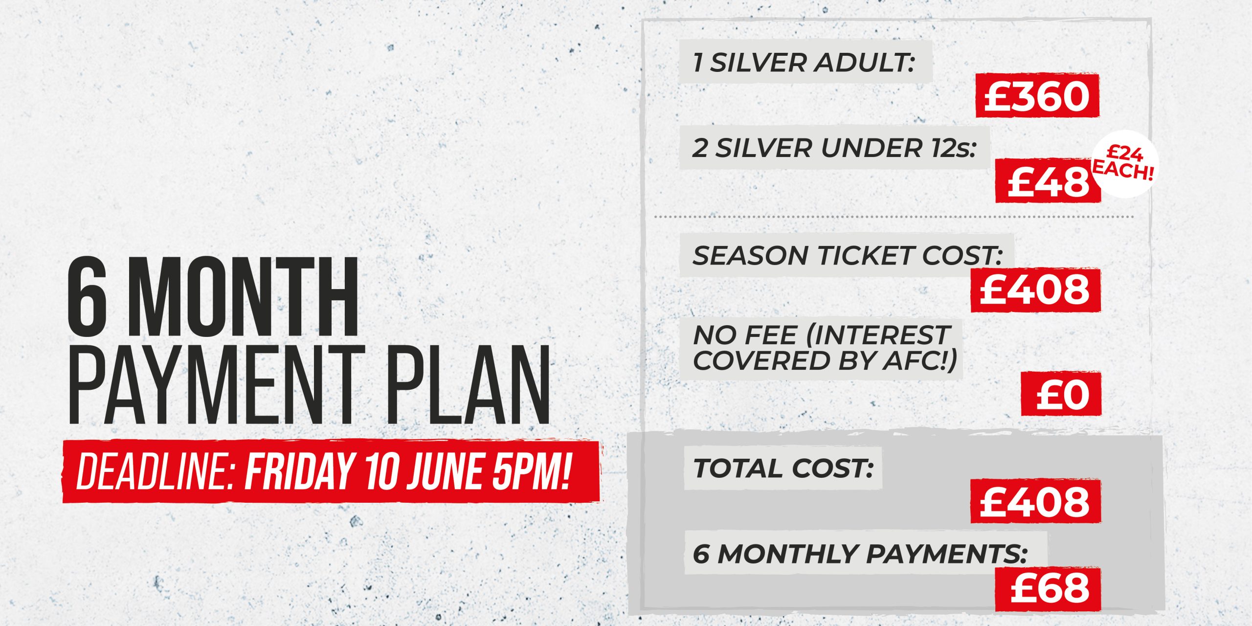 You can spread the cost over 4 or 6 months at 0% interest with fees covered by AFC, or choose to make payments over 10 months with a £34 fee* through V12 Season Ticket Finance.