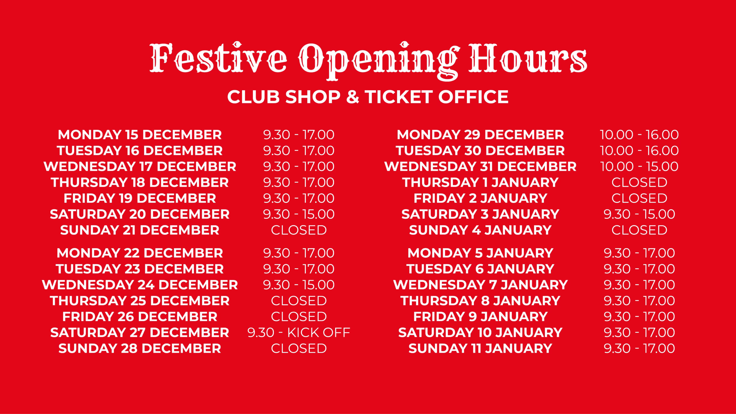 The Pittodrie Club Shop, Ticket Office and AberDNA Hub will be open during the following hours over the festive period: